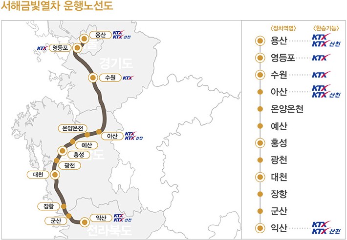 서해금빛열차는 용산역에서 출발하여 영등포역, 수원역, 아산역, 온양온천역, 예산역, 홍성역, 광천역, 대천역, 장항역, 군산역, 익산역을 차례로 지나는 한국철도공사의 관광열차입니다. 아래는 운행노선도 입니다.